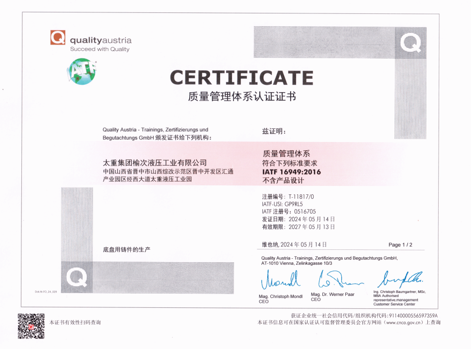 為了更好的適應(yīng)市場(chǎng)和產(chǎn)品的需求,太重榆液積極開(kāi)展各種認(rèn)證認(rèn)可工作,取得各項(xiàng)生產(chǎn)許可以及市場(chǎng)準(zhǔn)入資格。 被山西省科學(xué)技術(shù)廳認(rèn)定為高新技術(shù)企業(yè), 是國(guó)家級(jí)兩化融合貫標(biāo)試點(diǎn)企業(yè) ,通過(guò)職業(yè)健康安全管理體系認(rèn)證, 通過(guò)環(huán)境管理體系認(rèn)證。